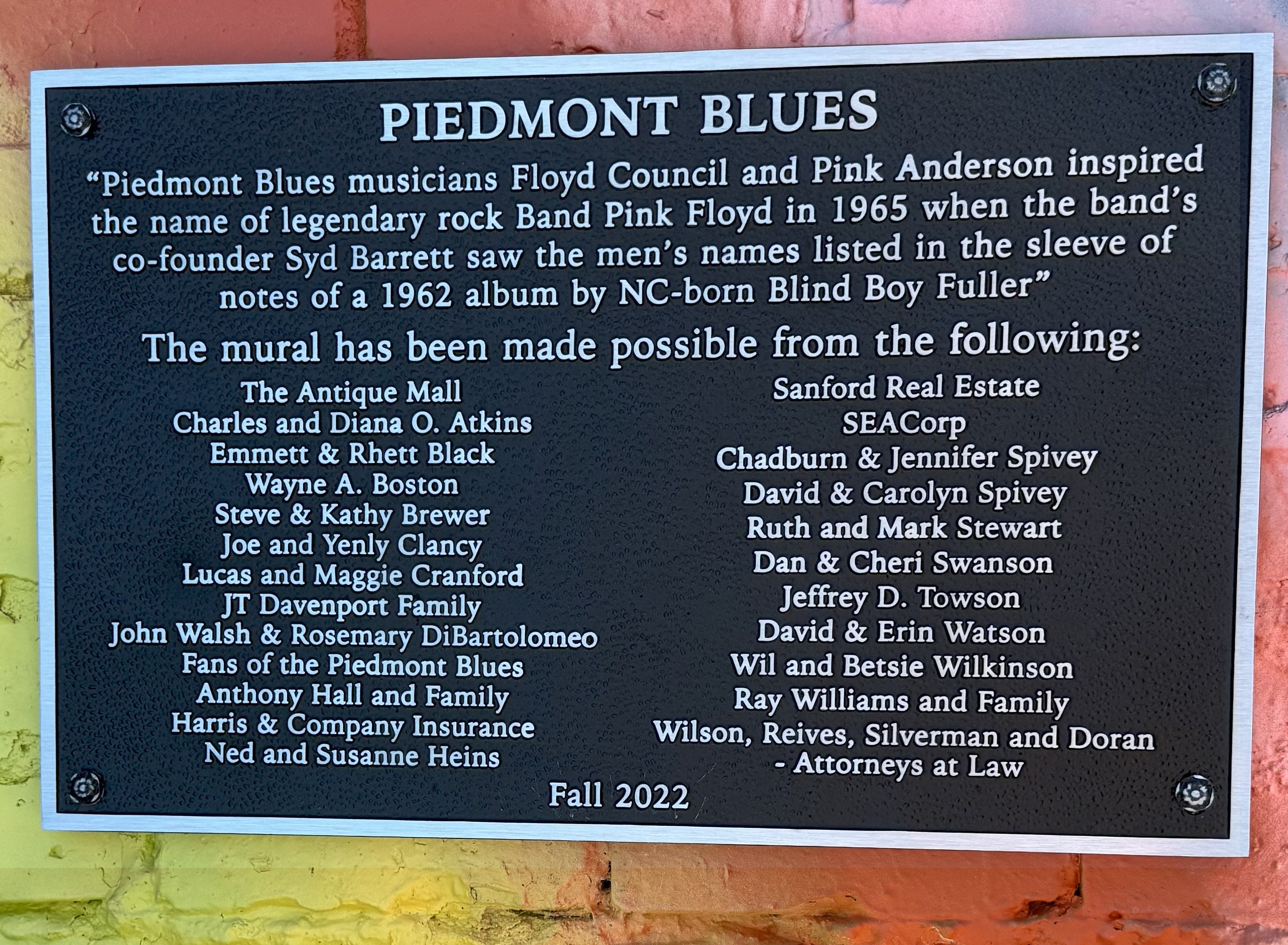 ♦ Muralist: Chris Dalton - Piedmont Blues - Along with Pink Anderson, blues musician and Sanford resident Floyd Council inspired the name of the legendary rock band Pink Floyd.